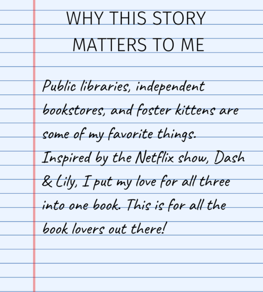 I had my setting. After binge watching Dash & Lily on Netflix, I knew I wanted my premise to be similar. Two teens who leave each other secret notes in public library books, assisted by a teen librarian, but who have no idea that they are volunteering together at the kitten nursery at Best Friends Los Angeles.