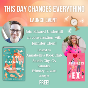 Author Chat with Edward Underhill at Annabelle’s Book Club in Studio City. I’ll chat with Edward about his latest YA book, This Day Changes Everything, and we’ll be signing our books!